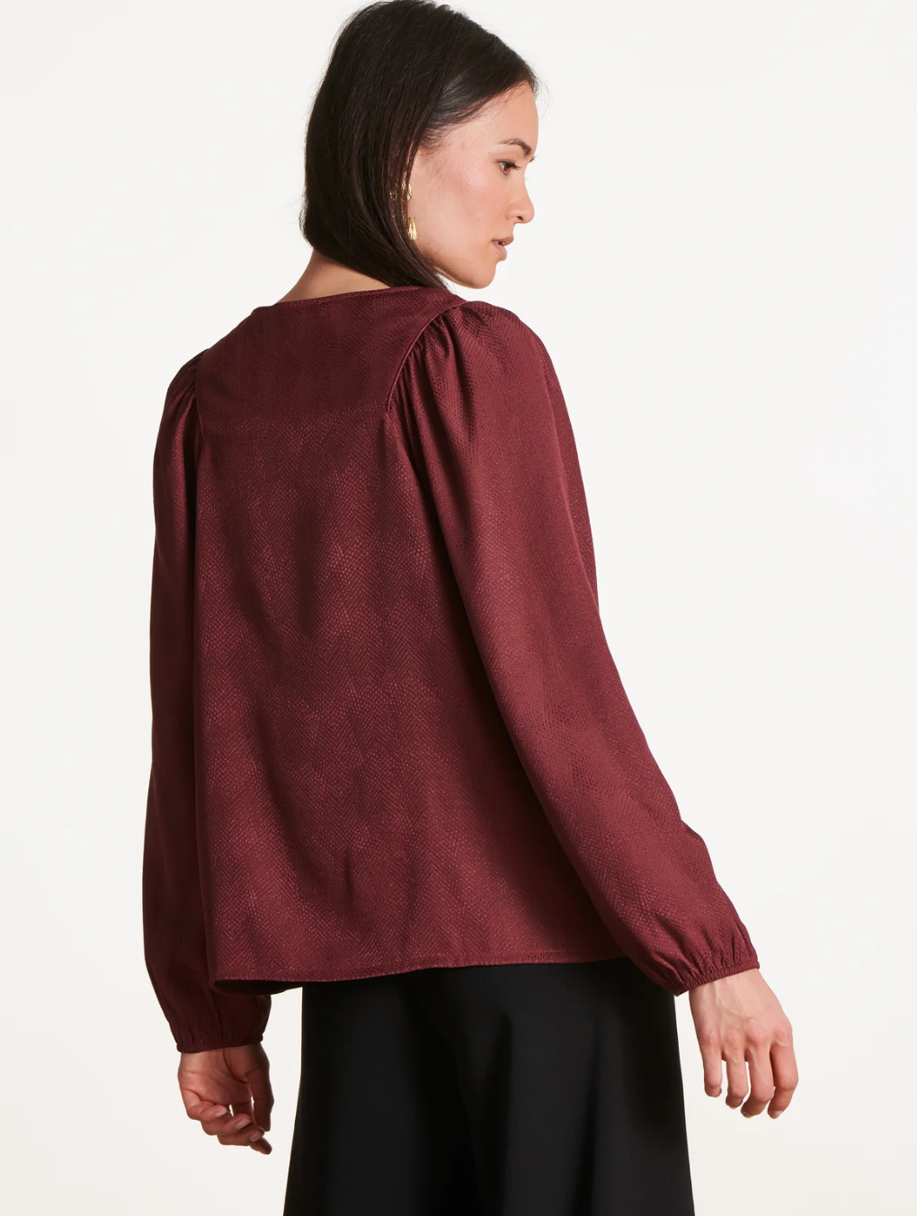 Experience effortless elegance with the Faye Burgundy Top, crafted from fluid Ecovero viscose for a soft, breathable feel. Its round neckline and gathered shoulders add subtle sophistication, while long sleeves with elastic cuffs ensure comfort and style. A back zipper provides a sleek finish, making this top an ideal choice for both work and evenings out.