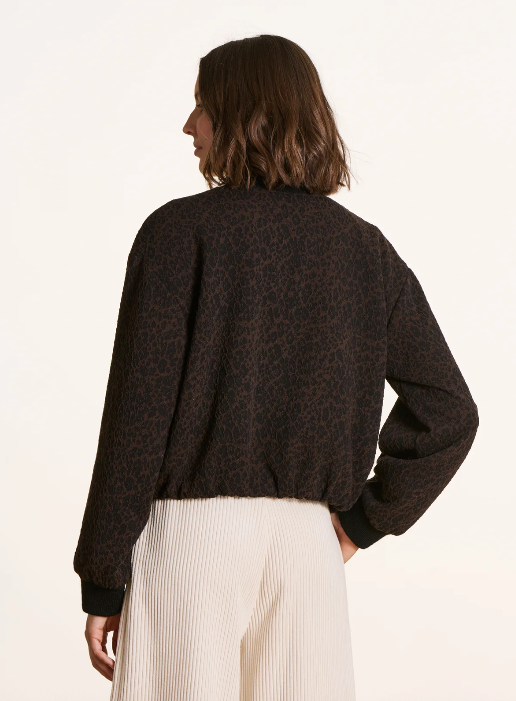 Stand out with the Faye Zipped Bomber jacket, crafted from leopard print Milano fabric for a bold, trendy look. Featuring a zip closure, long sleeves with elastic cuffs, and an elasticated hem, it offers a comfortable fit. Two front welt pockets and full lining complete this stylish, functional piece perfect for layering.
