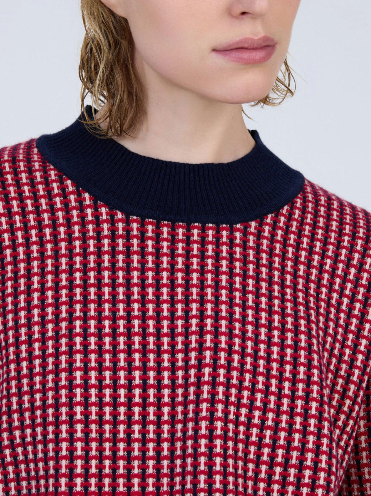 This carefully crafted knit sweater boasts a wide ribbed hem for a flattering fit, showcasing this season's top color combination of crimson and navy in a beautifully designed piece.