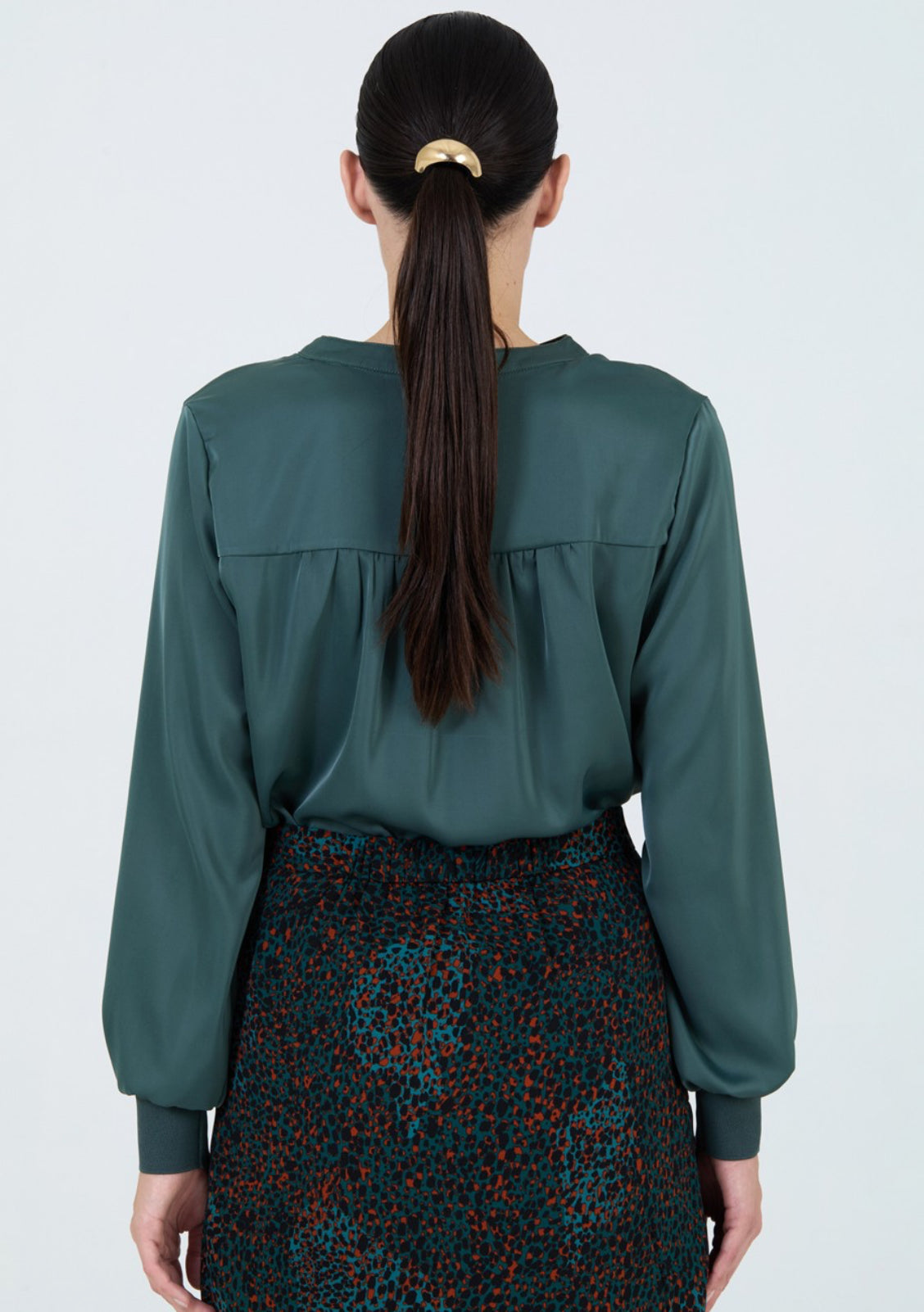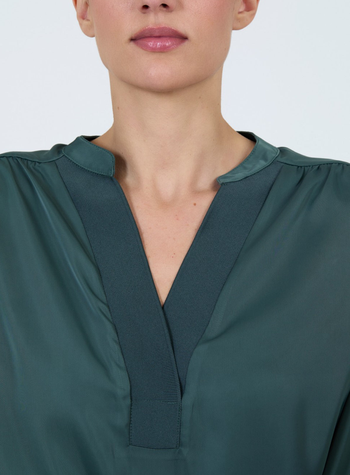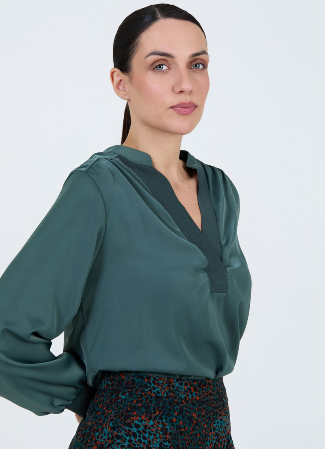 Blouse in satin fabric. Mao collar. V-neck. Detail of ribbed fabric on neckline and cuffs.