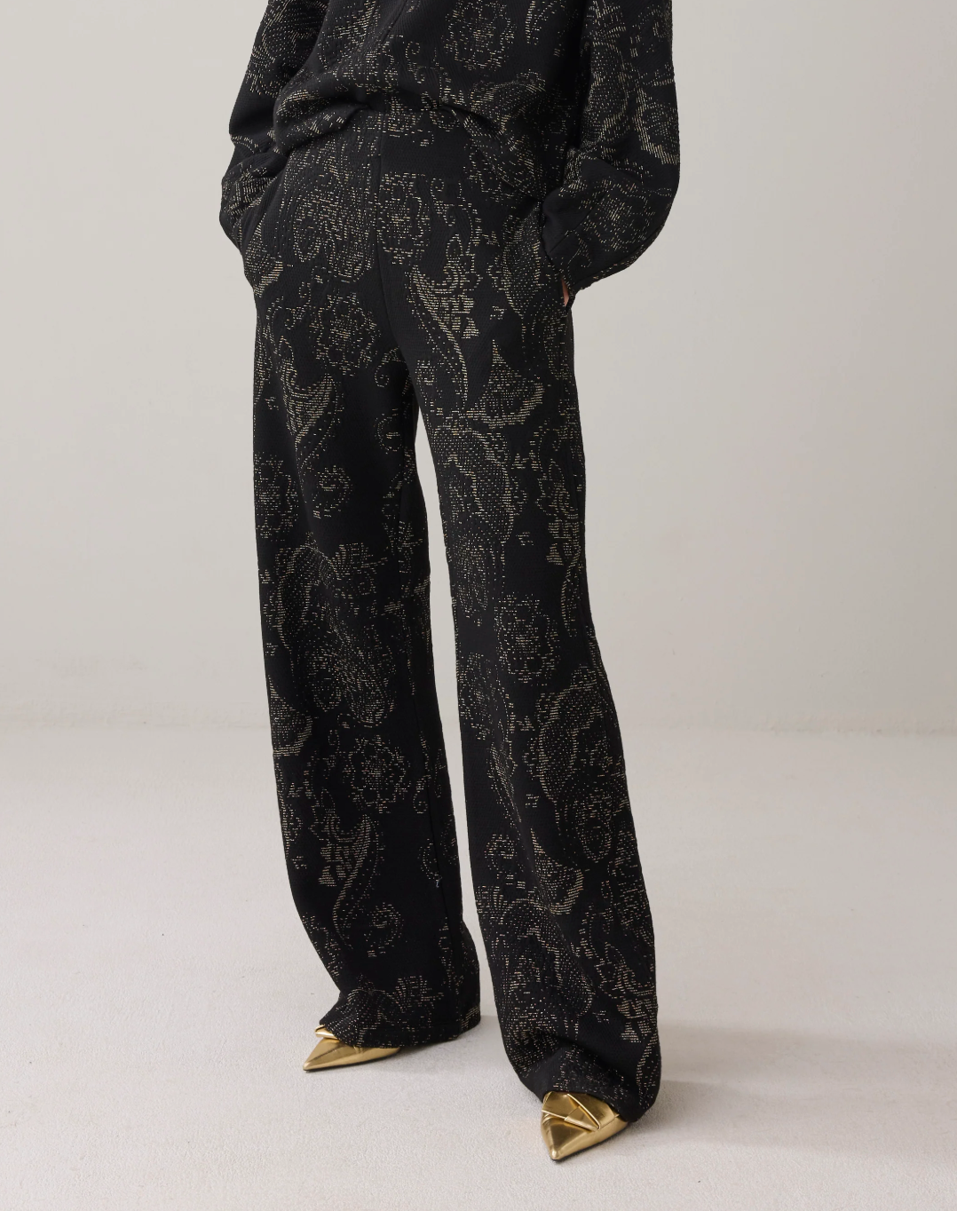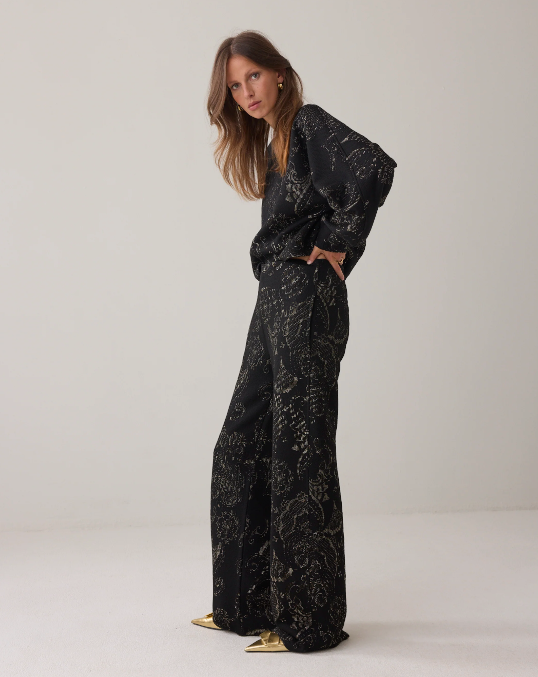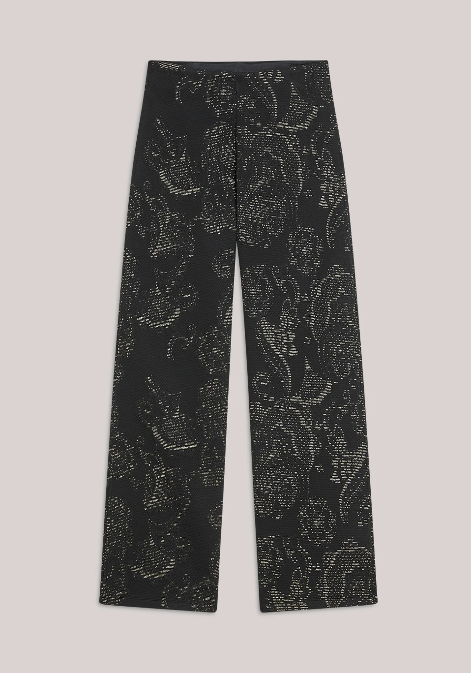 Festive comfortable trousers in shimmering foam jacquard with elasticated inner waistband. The trousers have straight wide legs, pockets in the side seam and fake welt pockets at the back. Pair nicely with the matching top 3s5215.