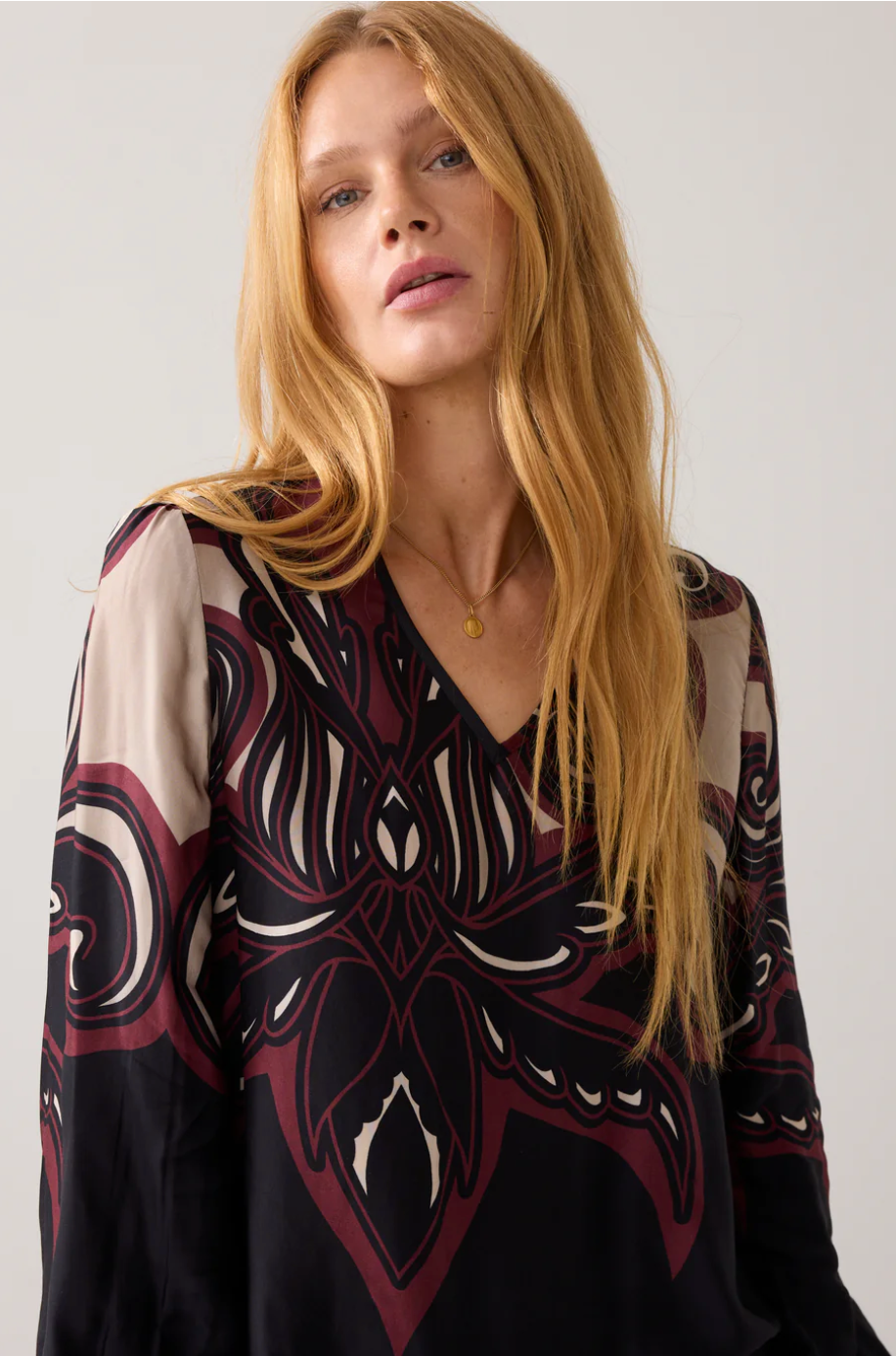 Top in satin viscose with a V-neck and straight cut. Each top is unique due to the random placement of the ornament print. The top has wide sleeves with fully smocked cuffs.