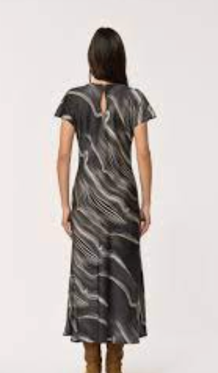 This Faye Evara Dress features a flattering bias cut and a chic swirl print in timeless black and ecru tones. Designed with a round neck and short sleeves, it’s perfect for autumn days when you want effortless style and comfort. Its unique cut enhances your silhouette, making it an elegant choice for both casual and dressier occasions.