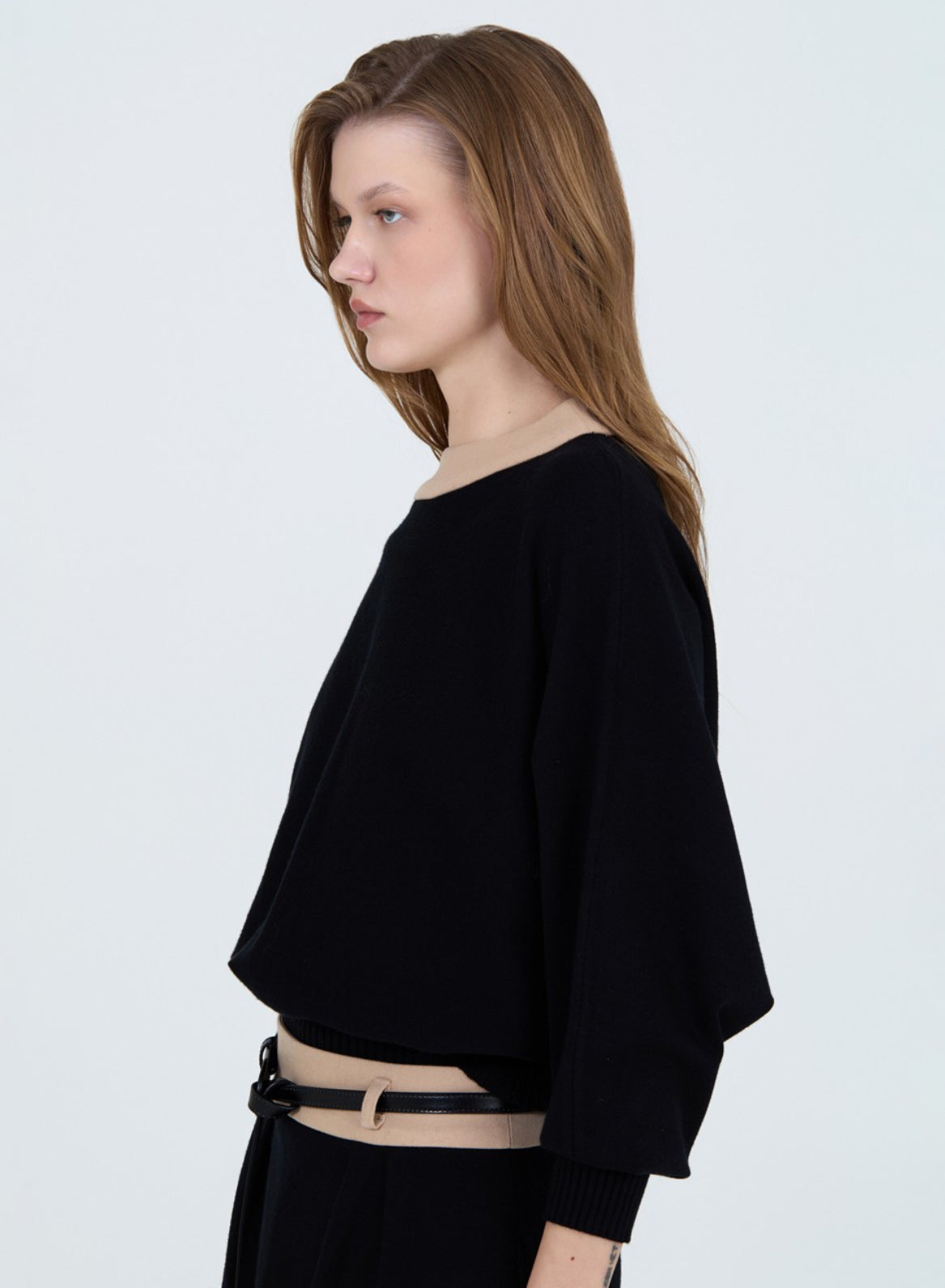 Bimaterial sweater with twill fabric collar and knitted body. Round neck with zipper fastening at the back. Long batwing sleeves.