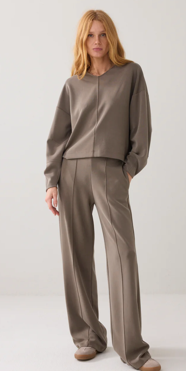 This boxy top is made of a soft modal jersey with a slightly washed finish that creates a matte, chic look. The top has a high V-neck and rounded hems. The rounded back is longer than the front.