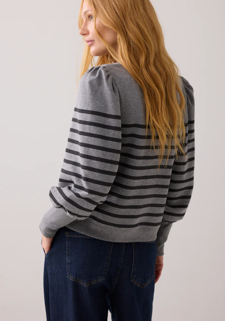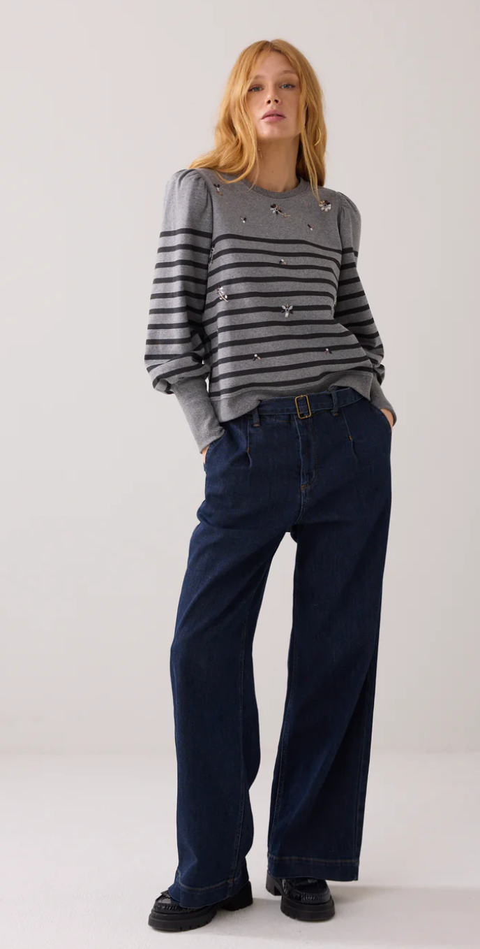 This feminine jumper is made from a soft sweat quality with a Breton print on a melange fabric. The jumper has an embroidered floral pattern of beads, sequins and rhinestones on the front.