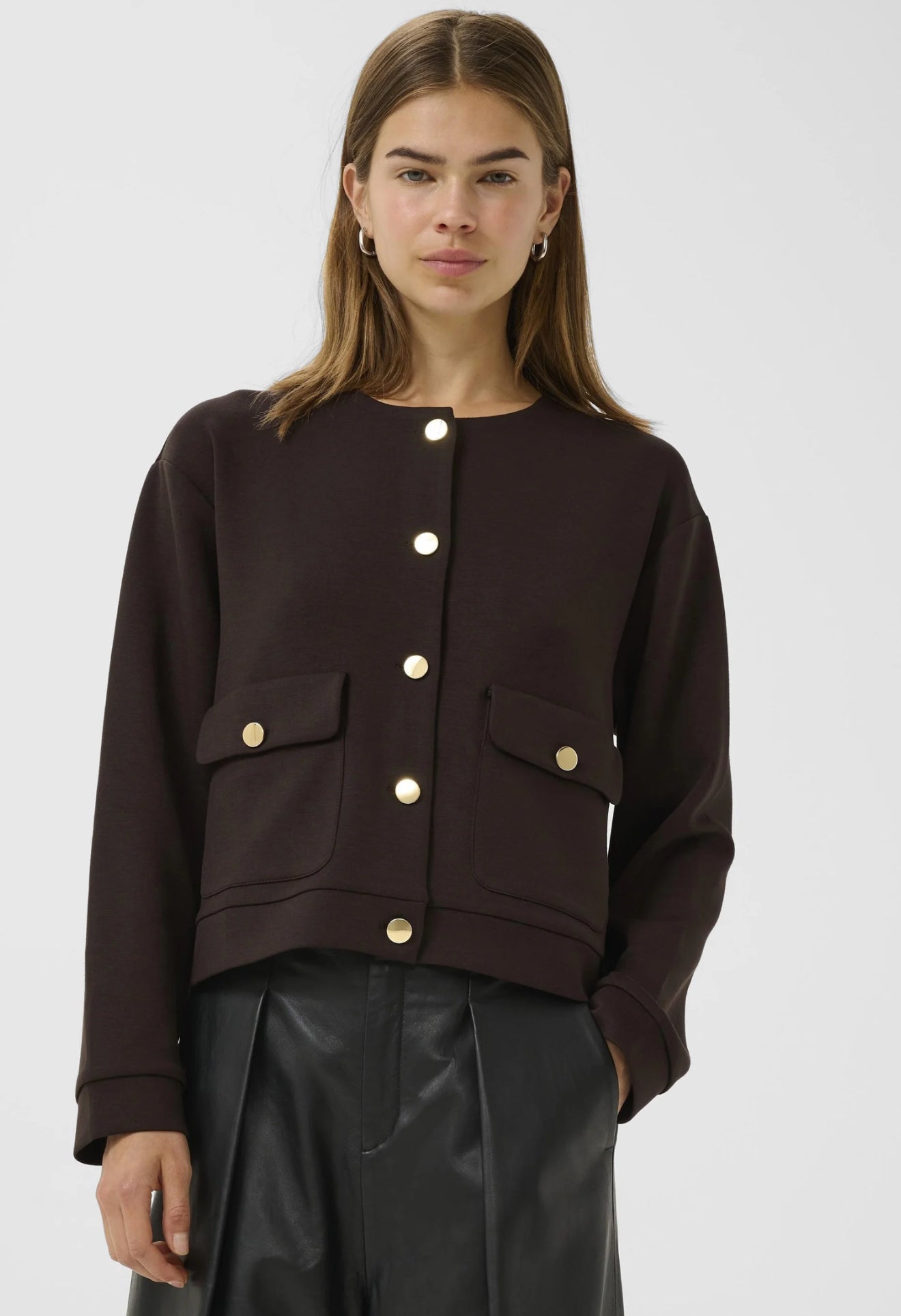 "The InWear Gida VincentIW Jacket is a sophisticated addition to any wardrobe. Made from soft modal, this casual boxy jacket boasts gold-toned buttons and a round neckline for a stylish touch. Its versatile design makes it the perfect choice for any occasion."