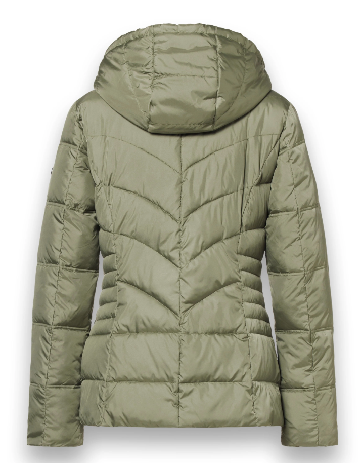 Recycled short quilted jacket with fantasy quilt design. Water-repellent fabric with a light shine. Detachable, adjustable faux fur-lined hood. Black contrast zippers with sporty cord pullers. Matching cord design on the drawstring hood. Two spacious zippered slit pockets. Cuffs with ribbed wind catchers. Inner pocket with button closure.