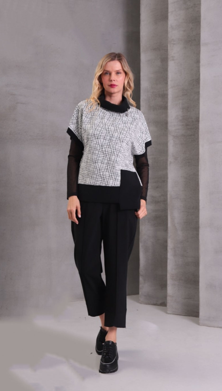 Tunic style top in cream and black with black trim, fab layered over a long sleeved black top for stylish daywear.