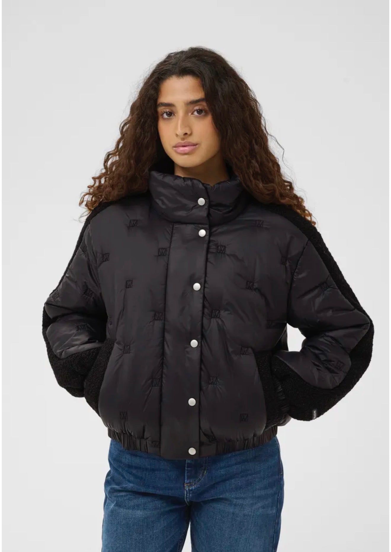 The high collar and snap-button closure provide a streamlined look, while the elasticated hem and cuffs create a flattering, easy fit. Perfect for layering between seasons, this versatile jacket pairs effortlessly with denim, tailoring, or casual essentials.