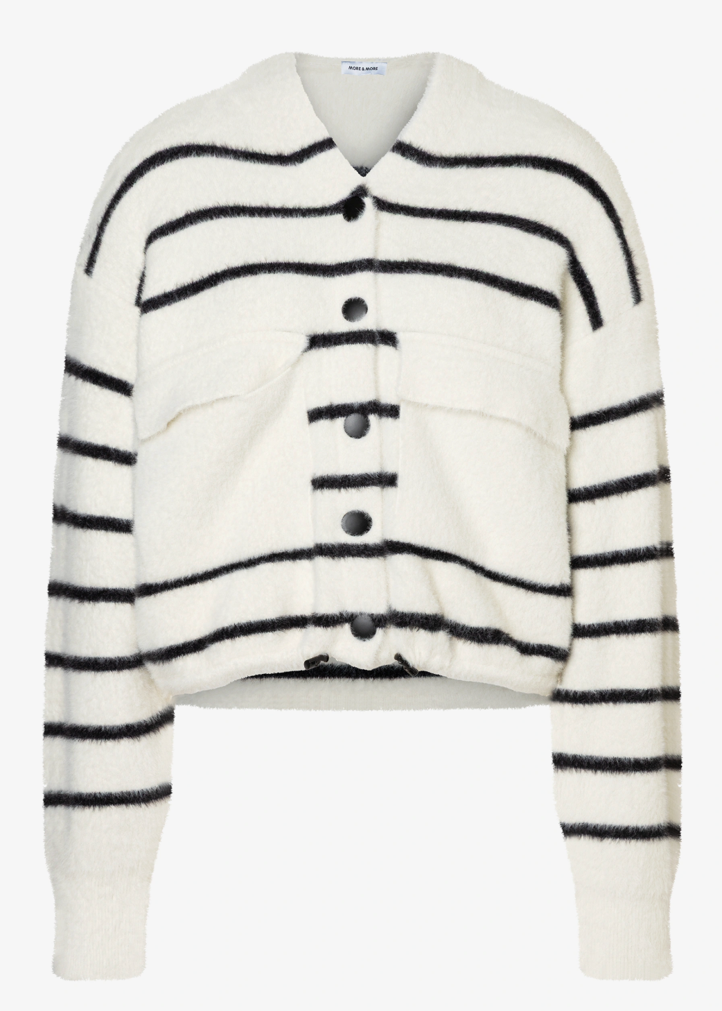 This cuddly-soft cardigan from MORE & MORE combines cozy vibes with clean style. The black stripe on a cream background, the relaxed fit, and the casual hood create a modern cardigan perfect for laid-back everyday looks.
