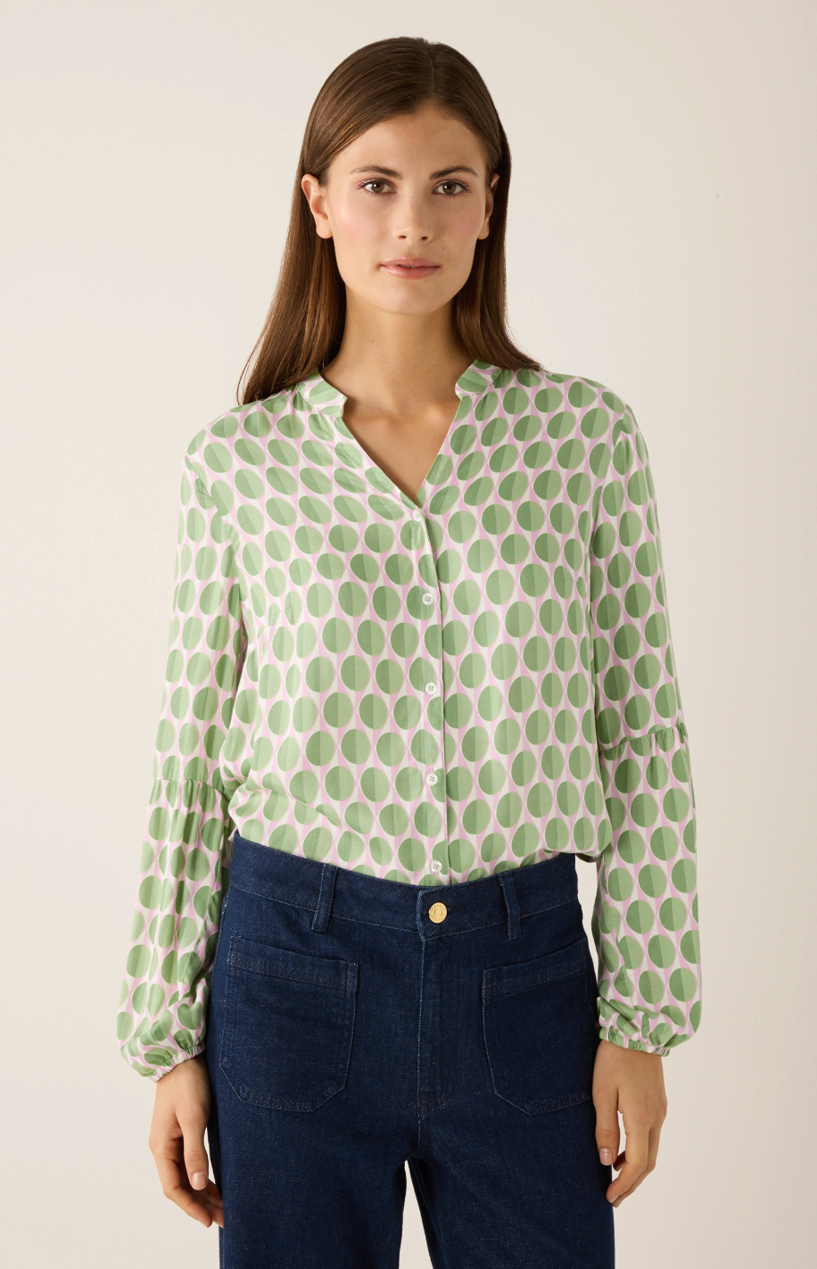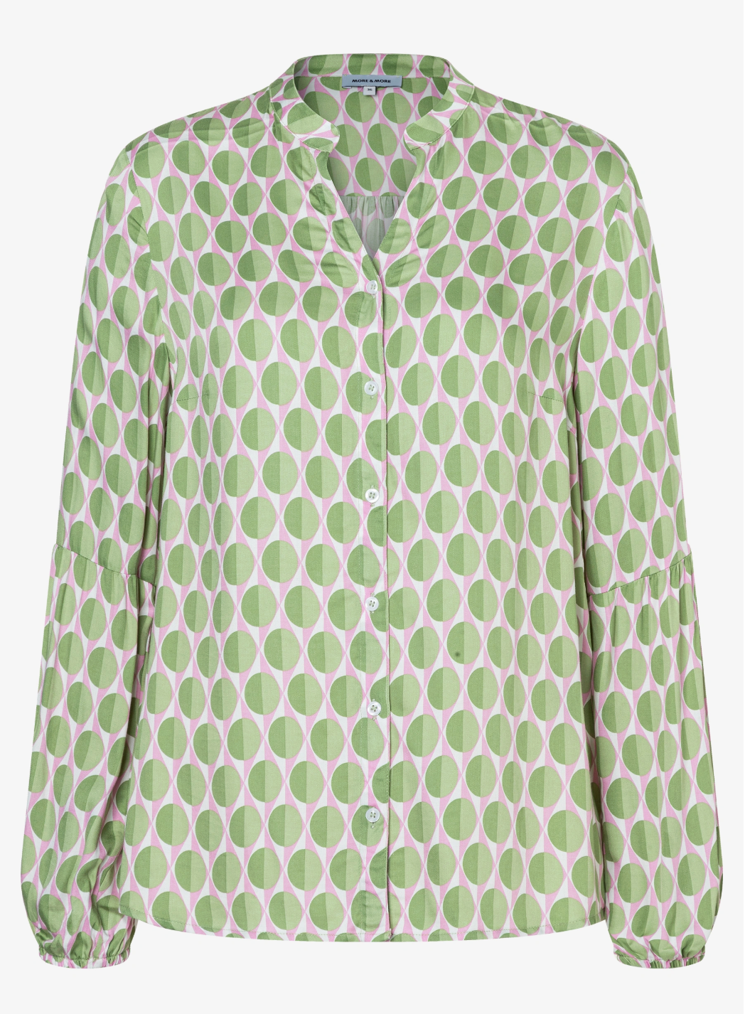 The flowing viscose blouse from MORE & MORE with a graphic mini print in pink/green can be combined classically with smart business trousers or casually with sporty jeans.