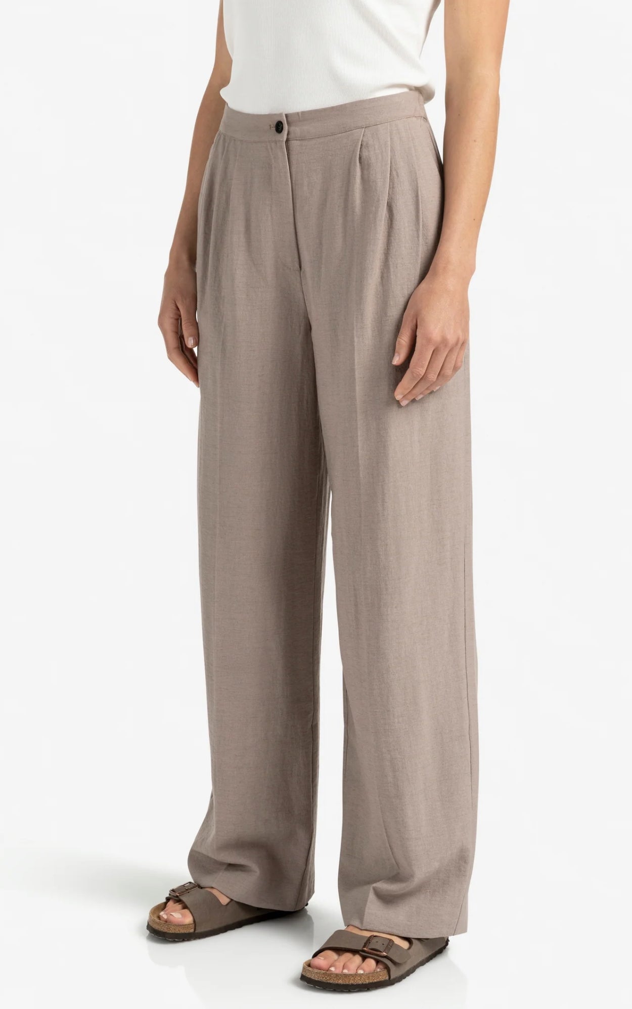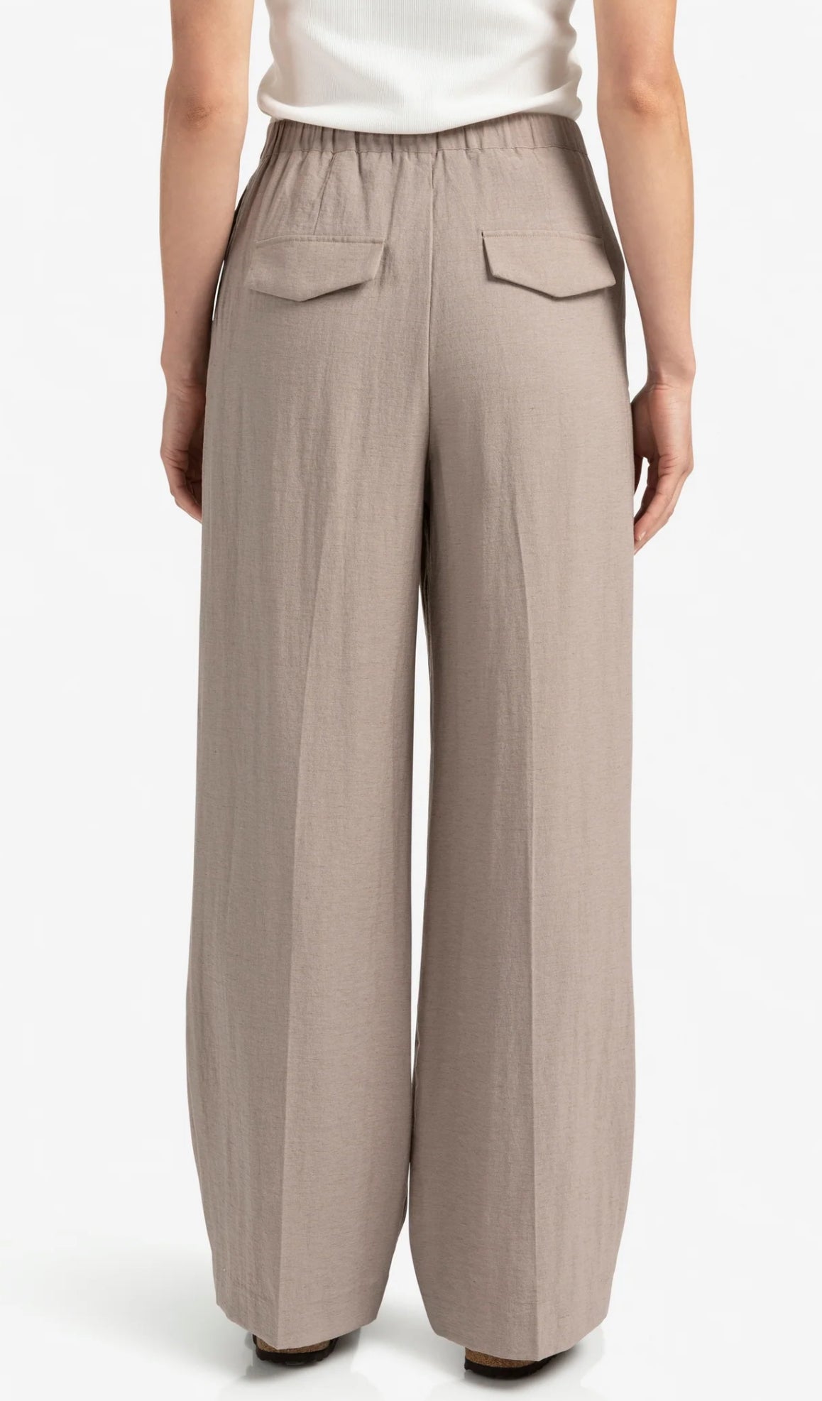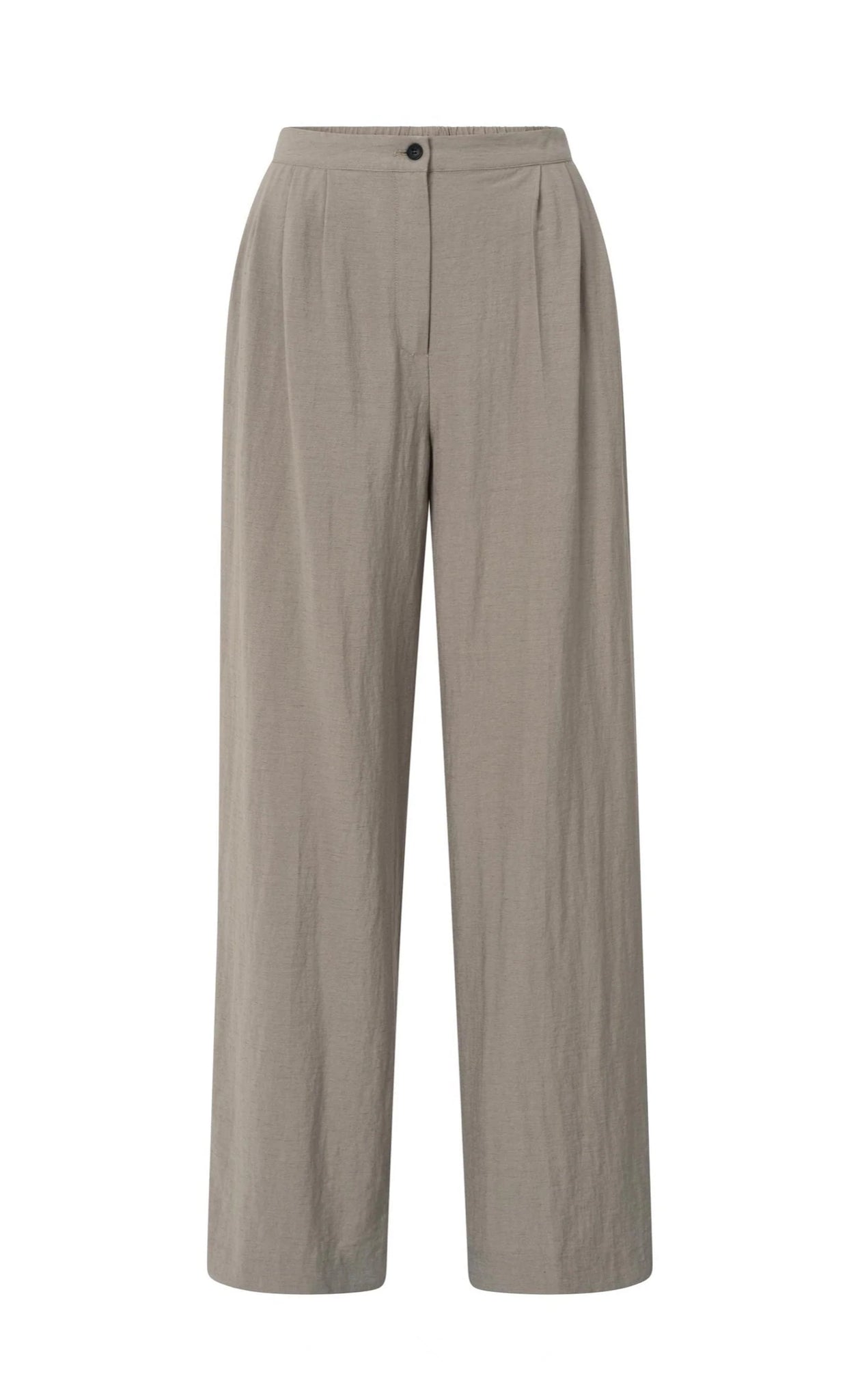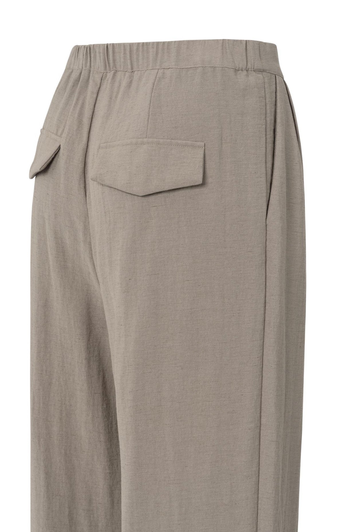 These trousers are made from a woven, structured fabric and offer a loose fit with straight, wide legs. The elastic waistband adds extra comfort. Designed with front pleats, side pockets and flap pockets at the back. A stylish and versatile piece for a laid-back yet elegant look. The model is 178 cm and wears size 36