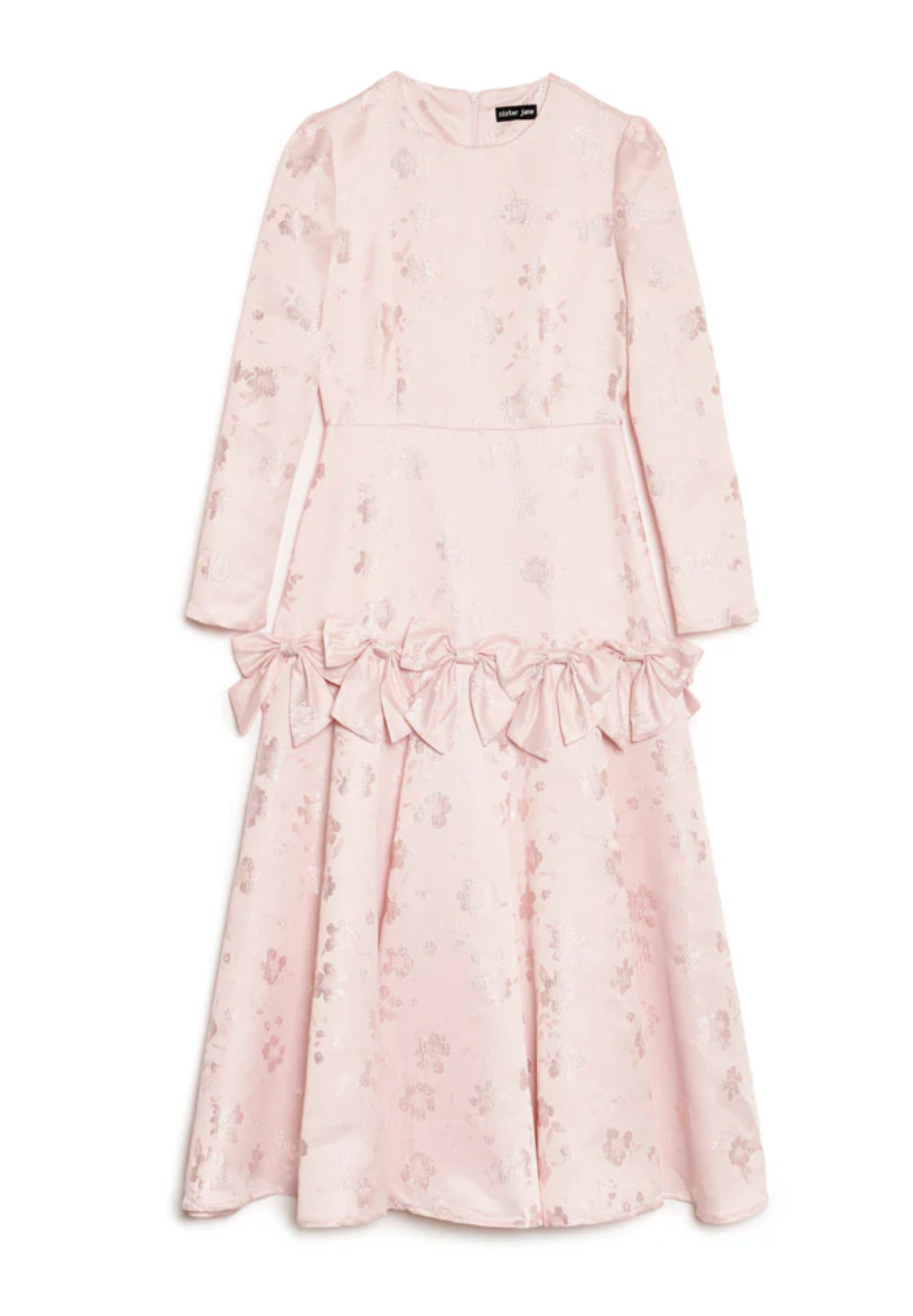 Glossy jacquard fabric and playful bows characterize this midi dress. Featuring a flared skirt perfect for graceful movement, it’s a piece that outshines even the brightest stage lights.