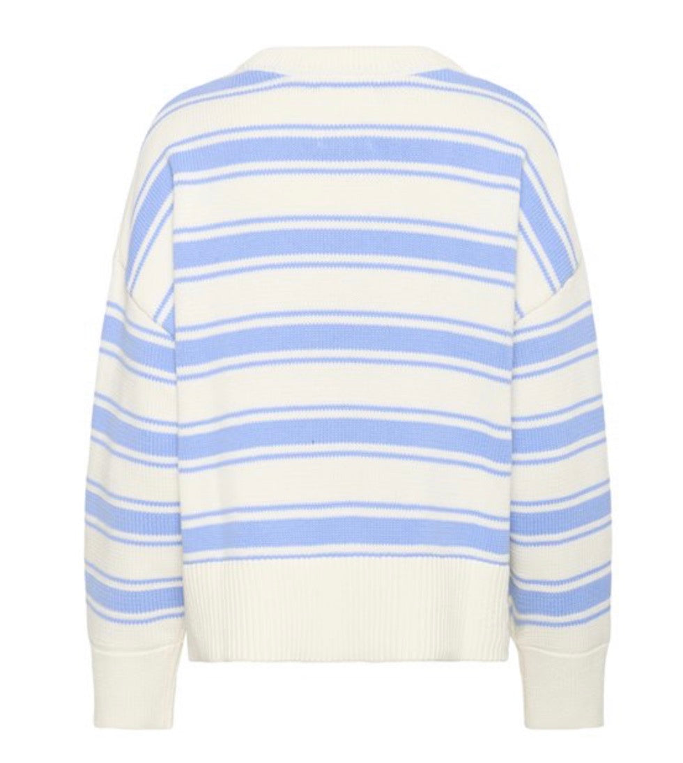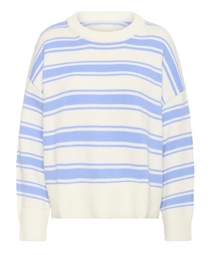 The model is 174 cm tall and wears a size M. This striped knit in pink and cream tones features a relaxed fit with dropped shoulders and wide ribbed trims, giving it a soft, casual feel. Perfect for everyday wear with jeans or layered over a dress for a laid-back yet polished look.