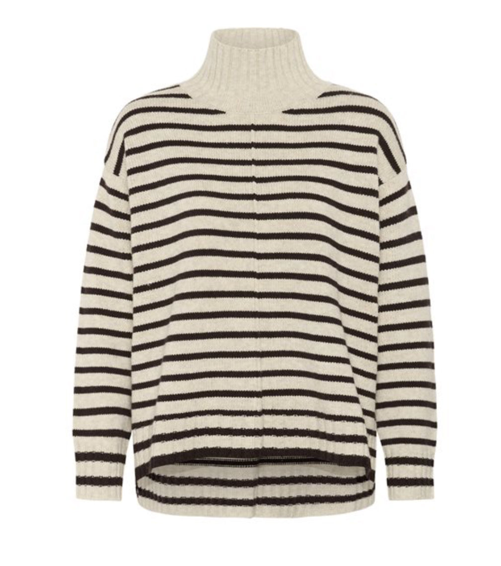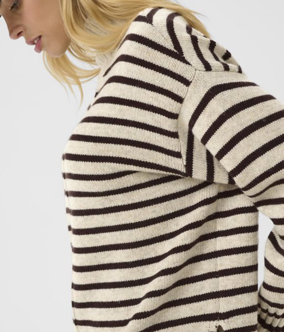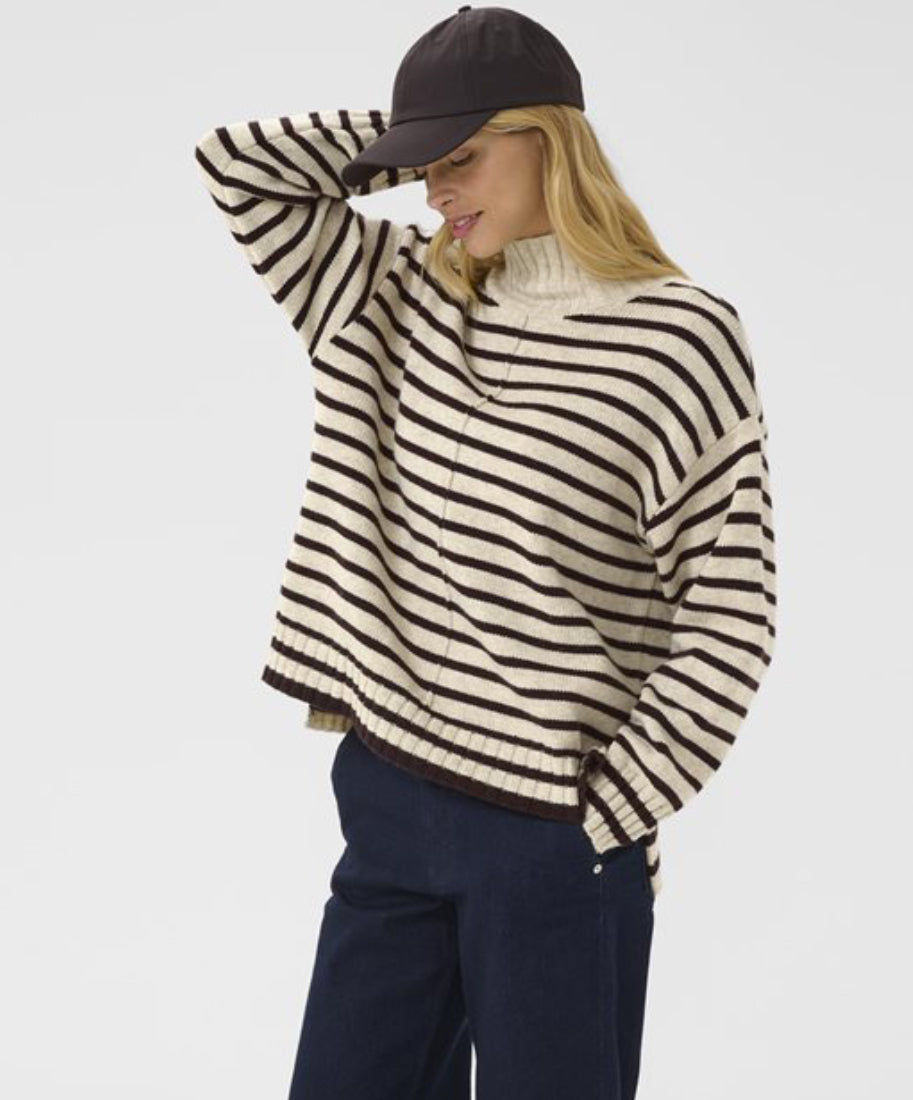 This piece is a Part Two Lilye sweatshirt, featuring a classic Breton-inspired stripe pattern. It has a high ribbed turtleneck and a relaxed, slightly oversized fit, making it ideal for layering. The knit features horizontal brown stripes on a cream background, creating a timeless and versatile look. The dropped shoulders add to the casual, cozy silhouette, while the ribbed cuffs and hem provide subtle structure.