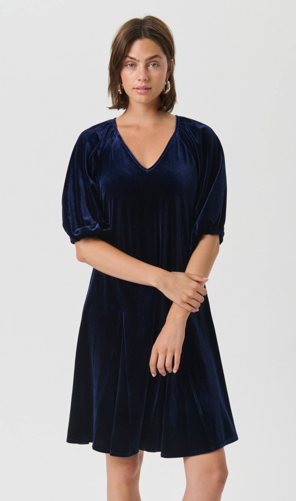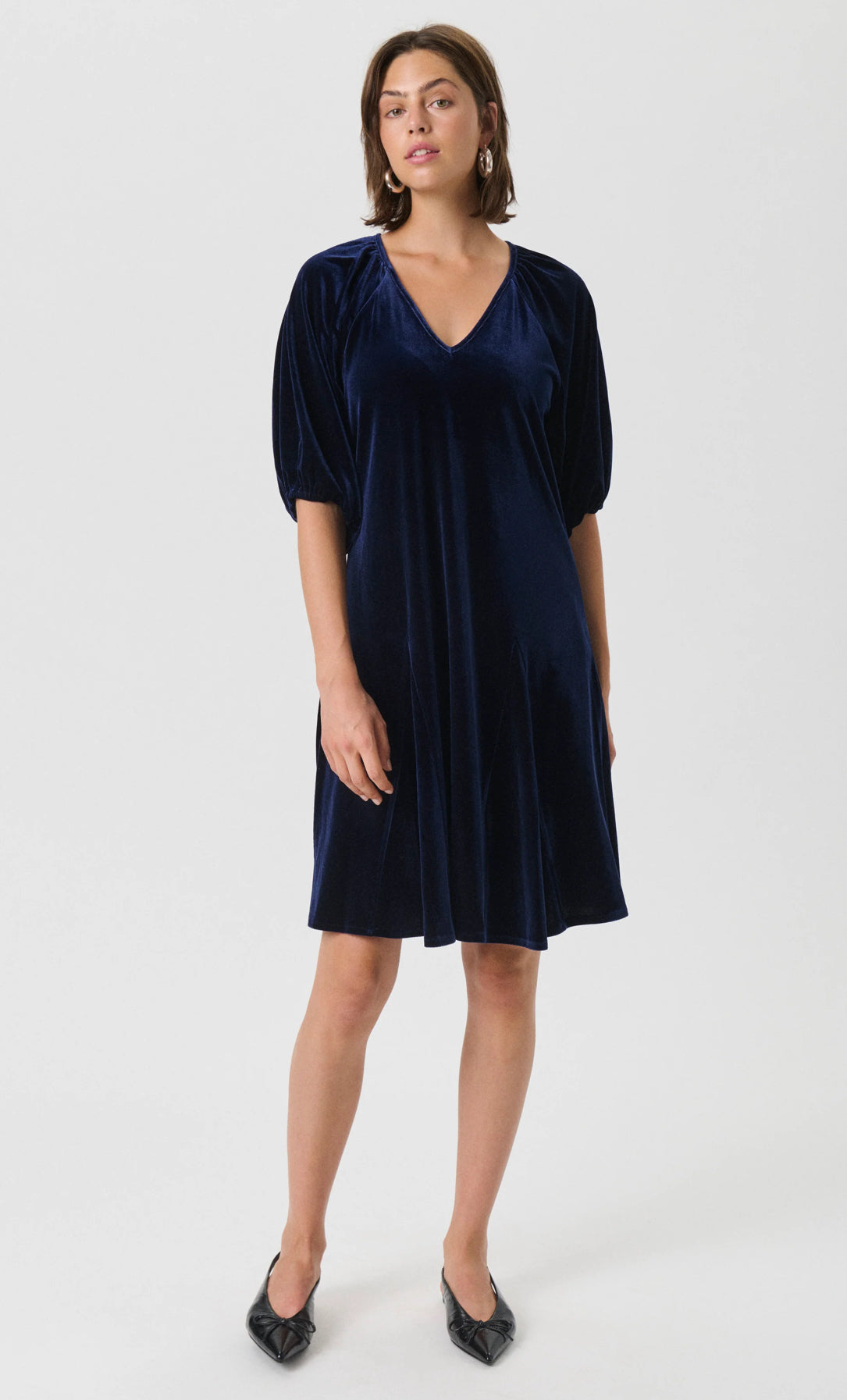 This deep navy velvet dress has a simple yet stylish look. The V-neckline and three-quarter sleeves add a feminine touch, while the gentle A-line cut ensures comfort and ease of movement. Wear it with tights for everyday wear or add jewellery and heels for an evening look.