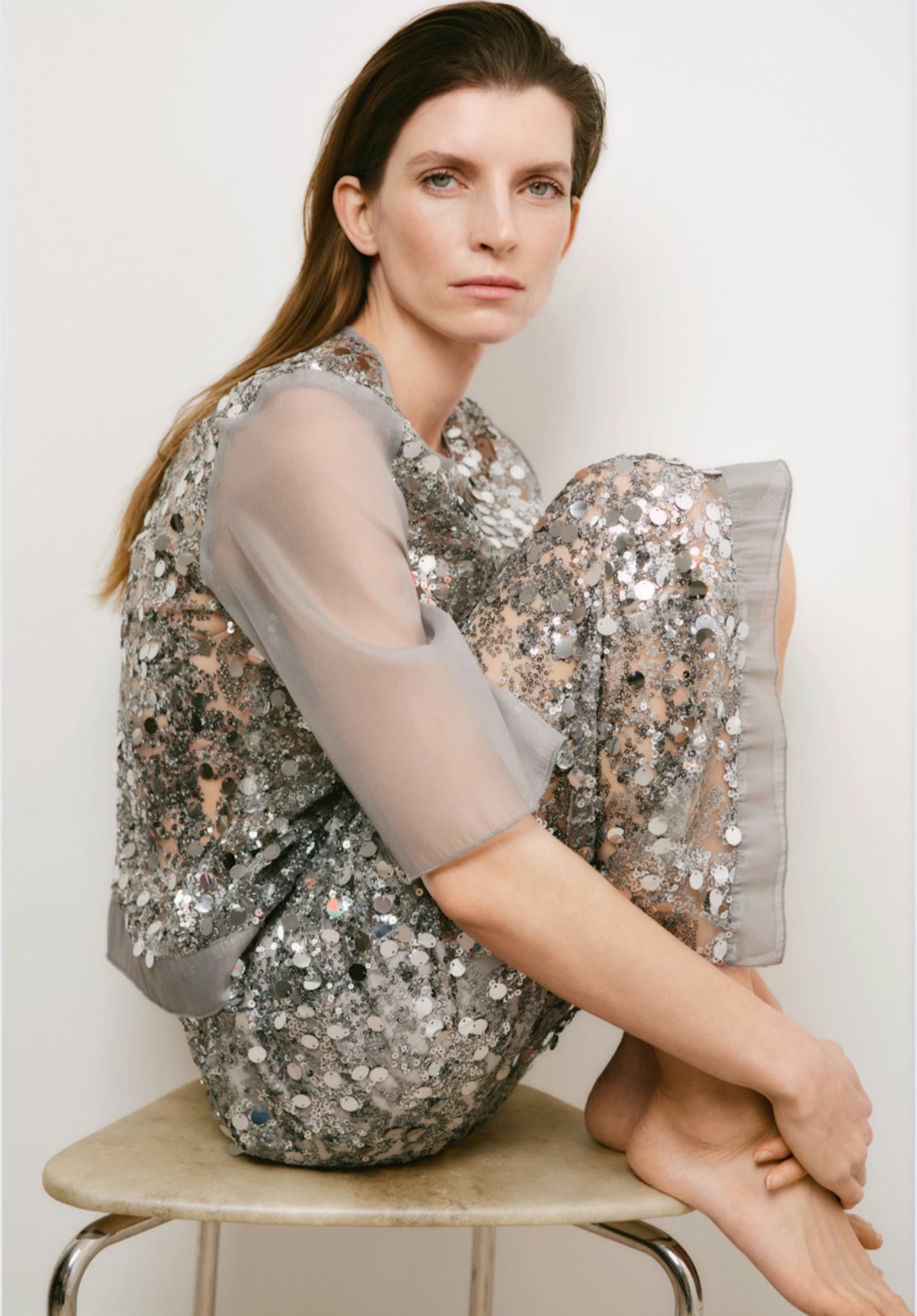 Sleeveless top with relaxed straight fit, featuring a soft texture and delicate eyelash lace trim along the V-neckline. Effortlessly refined with its clean silhouette and subtle layered detail at the neckline.