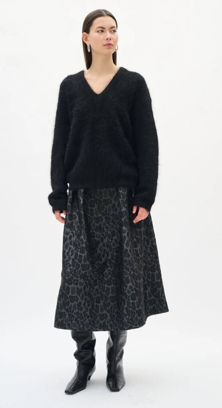 Whether styled with a crisp shirt for daytime elegance or a sequin top for subtle glamour, it’s a versatile skirt that transitions effortlessly across occasions. Available in classic black, it’s a foundational staple with modern appeal.