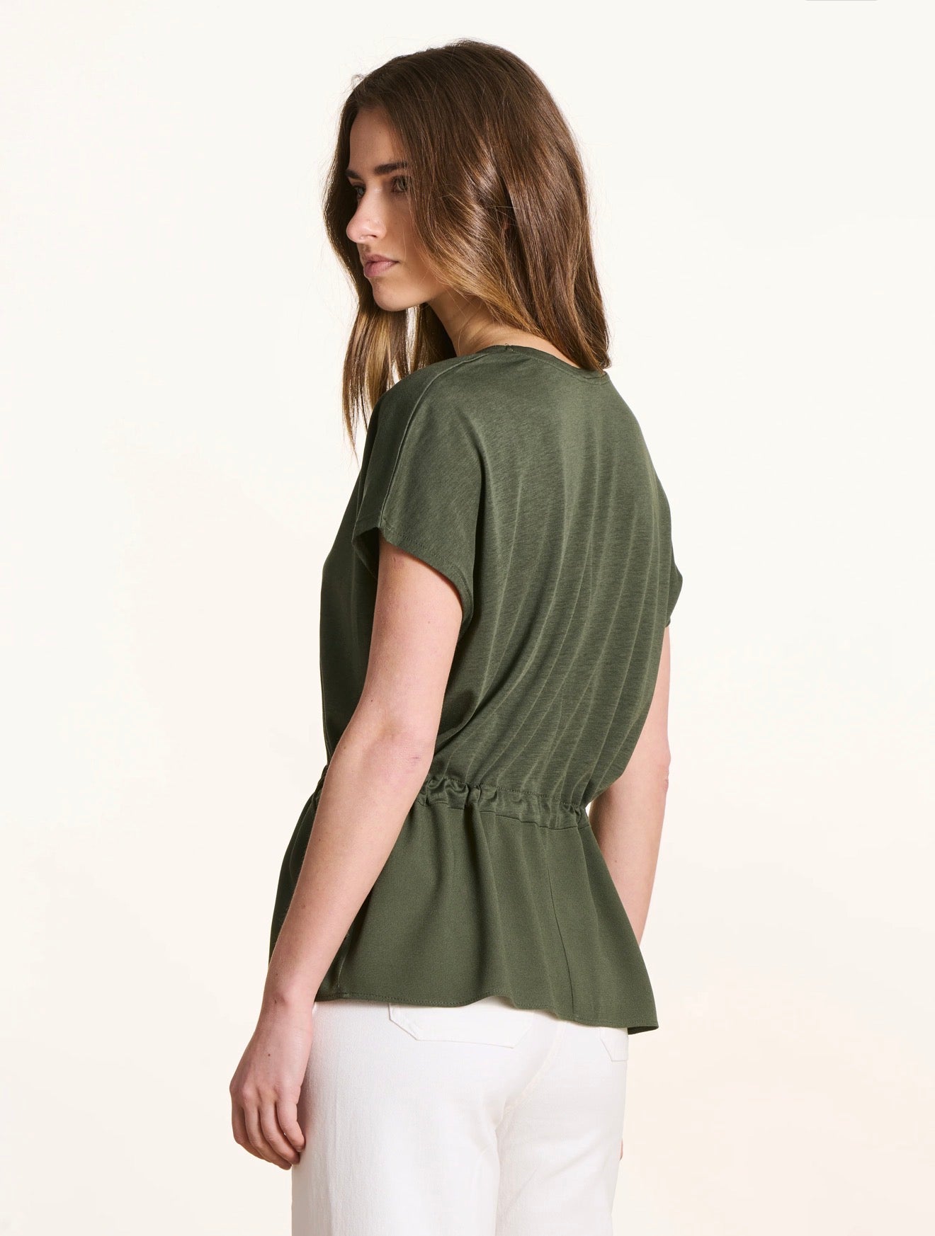 Loose fit bi-material T-shirt- Round neckline- Short sleeves- Drawstring with ties at the waist- Center back seam