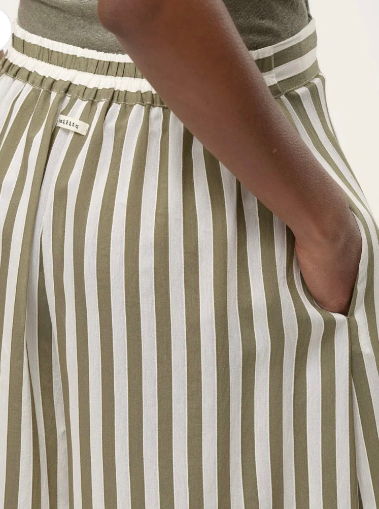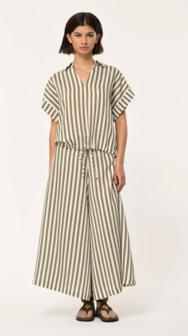 The Humility Khaki Stripe Trouser features a culotte style, offering a contemporary silhouette that enhances comfort and ease of movement. The khaki stripe design adds a sophisticated touch, making it suitable for various settings. Pair it with the matching blouse for a coordinated look that maintains a polished appearance.