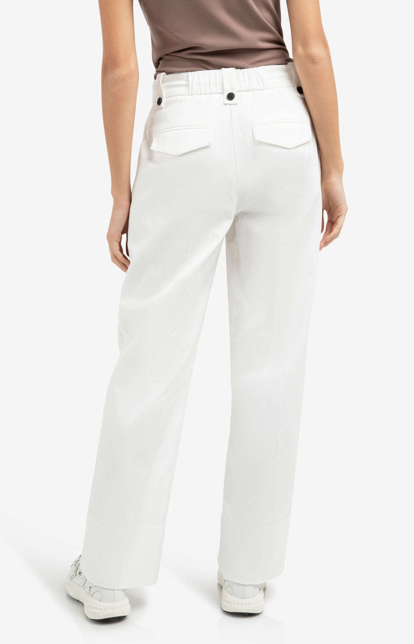 These comfortable woven trousers feature a high waist with elastic waistband and a drawstring with metal ends. Designed with pleats at the front and wide legs for a relaxed, feminine look. Finished with side pockets and welt pockets at the back. Perfect for casual yet polished styling. The model is 178 cm and wears size 36.
