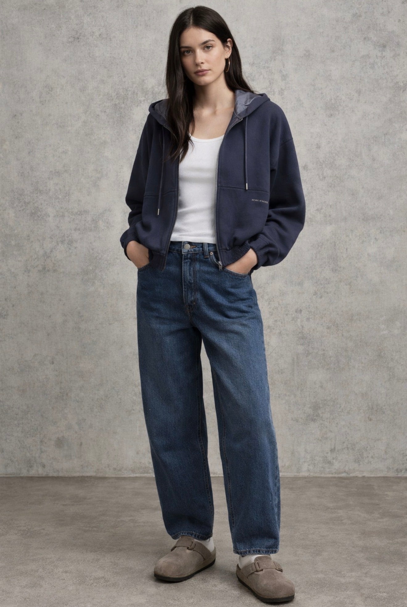 - Zip-through front with minimalist metal zip