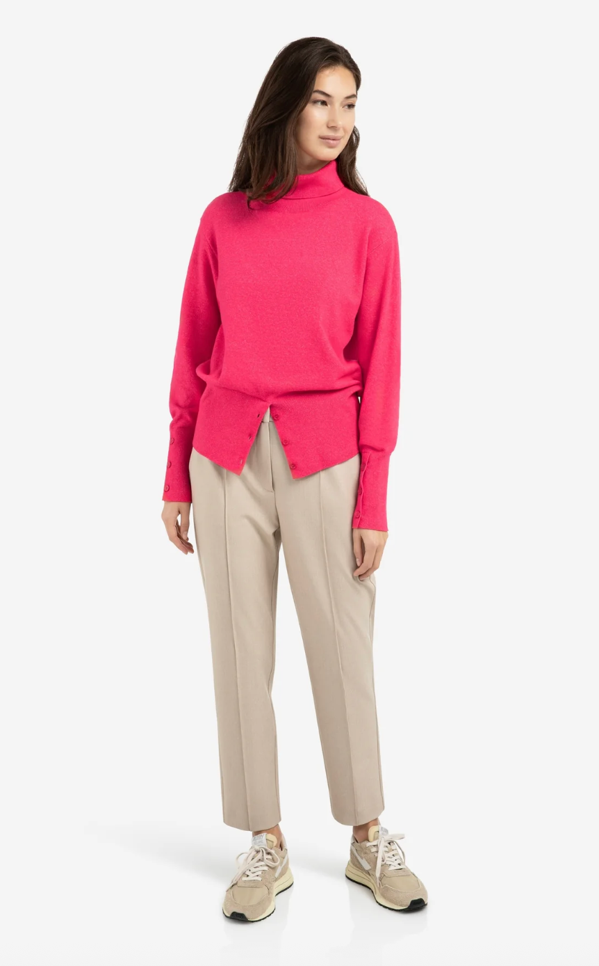 This elegant knitted sweater features a high turtleneck, a loose fit, long sleeves and a fitted waistband. Button details on the waistband and cuffs add a subtle playful touch to the design. Made from a soft and comfortable fabric thats easy to style for various occasions. The model is 175 cm and wears size S.